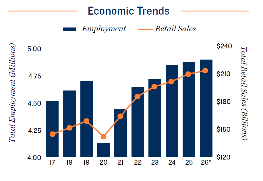Employment and retail sales are both trending upward but at a decelerating pace, signaling continued growth with some economic cooling ahead.